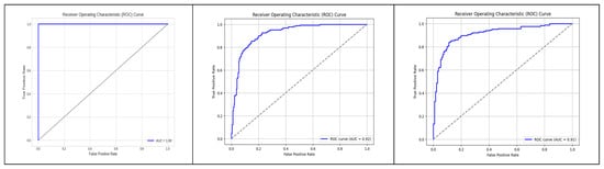 The performance of the binary classification model in Figure 9 was evaluated using the Receiver Operating Characteristic (ROC) curve. The ROC curve provides a graphical representation of the model’s ability to discriminate between positive and negative instances across different classification thresholds. The curve plots the True Positive Rate (sensitivity) against the False Positive Rate (1-specificity). The Area Under the Curve (AUC) is a summary measure of the model’s overall performance, with a higher value indicating better discrimination. In our study, the AUC for the model was 1, indicating strong predictive performance and the rest of the two-model performance was over 90 percent.
