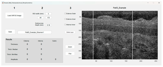 Figure 1 shows the user interface after loading a UHFUS image. A range of interest (ROI) of 5 mm was decided upon for image quality and representation of the bowel wall, including continuity in the bowel wall.