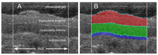 Ultrasonography is a diagnostic imaging method based on acoustic echoes and tissue-specific acoustic impedance. The amplitude, i.e., the strength of the reflected ultrasound waves, is described as hyperechoic with higher amplitudes (seen as white areas)—as in fat and collagen—hypoechoic, or anechoic (seen as gray or black areas, respectively) [1,2]. In daily medical use, ultrasound transducers transmitting 2–15 MHz are used, giving a good overview of the organs by imaging tissues to a depth of 2–20 cm. In contrast, UHFUS, with its much higher frequencies (30–50 MHz center frequency), allows for detailed imaging to depths of 0.1–5.0 mm [3,4]. UHFUS has been suggested to be promising for detailed diagnostics in several clinical areas [4,5,6]. Since the thickness of the bowel wall in small children is reported to be 0.3–2 mm, the use of UHFUS in the diagnosis of bowel diseases has also been suggested [7]. Hirschsprung’s disease (HD) is a congenital disease characterized by the absence of ganglia cells within two of the histoanatomical layers of the bowel wall. Currently, diagnosis of HD is by histopathological and immunohistological analyses of tissue biopsies [8], which are time-consuming and costly to perform. In order to replace the use of biopsies both during primary and surgical diagnosis with an instant and secure diagnostic method, the use of UHFUS is being explored [9]. Histoanatomical differences between aganglionic and ganglionic bowel wall have been suggested, and good correlations between histoanatomy and UHFUS of bowel wall specimens from HD patients have been confirmed [10]. Initial clinical observations have shown that UHFUS has the potential to delineate between aganglionic and ganglionic bowel wall [11]. The problem is that the assessment and calculation of histoanatomical measurements within UHFUS images could be both inaccurate and time-consuming, as well as associated with certain observer bias. To obtain reliable measurements of bowel wall layers quickly and easily, avoiding internal variability and limiting observer bias, a computerized assessment of the bowel wall within the UHFUS image is warranted. This would accelerate research by facilitating multiple measurements and enabling collection of amplitude information. Therefore, to be able to more precisely and objectively assess and calculate histoanatomical morphometrics, a computer program for UHFUS diagnostics is required.