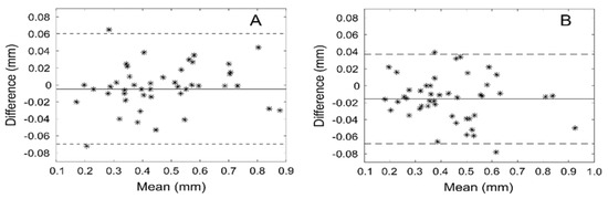 Bland-Altman plots that show the differences between users’ measured thicknesses against their mean for muscularis externa (A) and muscularis interna (B) mm—millimeters.