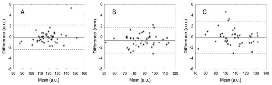 Bland-Altman plots that show the differences between users’ measured amplitudes against their mean for muscularis externa (A), muscularis interna (B) and submucosa (C) a.u.—albitrary units.