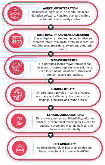 Notwithstanding these significant strides, integrating AI within radiology invites a suite of challenges that need to be addressed. The construction of robust and reliable AI models necessitates access to extensive datasets and thorough validation, both of which can be challenging due to privacy concerns and the heterogeneous nature of medical imaging data. Second, ensuring the interpretability and explicability of the “black-box” dilemma in deep learning models is paramount to garner trust and adoption from both radiologists and patients. Lastly, integrating AI into existing clinical workflows and fostering a harmonious human-AI collaboration are essential to fully realise the potential of AI in radiology and translate these technological advances into tangible enhancements in patient care.