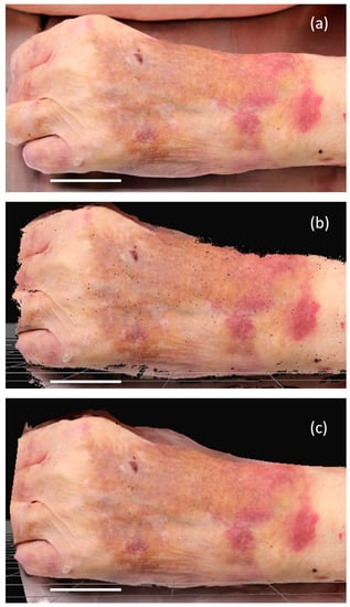 Bruises on a left hand: (a) photograph; (b) point cloud; (c) 3D mesh. The scale bar (white line in the figures) is 5 cm. A canon 5Ds-r with a 50 mm primer was used for the photographs and the software 3DF Zephyr, version 6.507 [] for creating the 3D models.