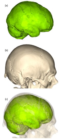 Three-dimensional models of the skull and of the brain from different imaging modalities: (a) 3D models from PMMR; (b) 3D model from PMCT; (c) combined 3D models. The 3D models were generated and aligned using Mimics software, version 24 [].