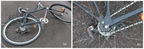 A 3D model (mesh surface) of a bicycle obtained with photogrammetry: (a) overview of the bicycle; (b) a detailed view of the same bicycle. A canon 5Ds-r with a 24 primer was used for the photographs and the software 3DF Zephyr, version 6.507 [] was used for creating the 3D model.