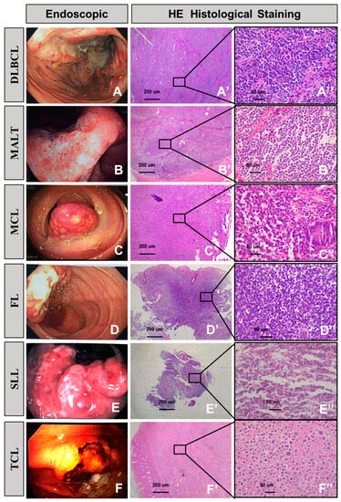 Endoscopic manifestation and corresponding histological features of gastrointestinal lymphoma. Diffuse large B-cell lymphoma (A,A’,A”). (A) Endoscopy revealing a fungating ulcer lesion. (A’) Transmural infiltration of large lymphoma cells. (A”) Most of the tumor cells resemble centroblasts and immunoblasts. Mucosa-associated lymphoid tissue (B,B’,B”). (B) Endoscopy reveals a superficial infiltration lesion. (B’) The diffuse lymphocytes infiltrate and extend into the submucosa. (B”) Monomorphic expansion of small lymphocytes. Mantle cell lymphoma (C,C’,C”). (C) Protruding without ulcerative lesions involving the colon. (C’) Low power, glandular structures are well-preserved. (C”) High power demonstrating a small- to medium-sized cell population. Follicular lymphoma (D,D’,D”). (D) Endoscopy revealed an ulcer in the ileocecum. (D’) Part follicular proliferation of centroblasts and centrocytes. (D”) Focal atypical follicle formation. Small lymphocyte lymphoma (E,E’,E”). (E) Endoscopy reveals protrusion with superficial ulcer involving rectum. (E’,E”) Neoplastic lymphocytes that are small, with scattered paraimmunoblasts. T cell lymphoma (F,F’,F”). (F) A gastric ulcer with hemorrhage on endoscopy. (F’,F”) The tumor cells show marked pleomorphism and a cytomorphological spectrum, ranging from medium to large to bizarre-appearing binucleated and multinucleated cells.