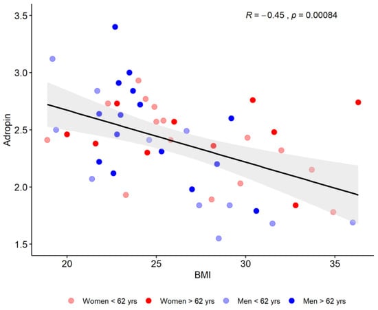 The whole sample showed only a significant positive correlation of adropin values with age (p = 0.020) and a negative value with BMI (p < 0.001) as shown in Figure 1.