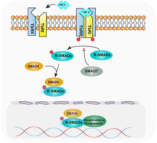 SMAD family proteins function primarily in the TGF-β pathway. TGF-β family ligands initiate downstream signalling events by activating transmembrane serine-threonine kinase receptors, namely, the TGF-β type I receptor (TbRI), which is also named as activin receptor-like kinase 5 (ALK5), and the TGF-β type II receptor (TbRII). On ligand binding, TbRII forms a heterotetramer with TbRI/ALK5, and the glycine/serine-rich (GS) structural domain of TbRI/ALK5 is phosphorylated by TbRII, which is a 30 amino acid region rich in glycine and serine that precedes the kinase structural domain. Anchoring proteins capture R-SMADs for presentation to activated type I receptors [13,14]. Inactive SMADs are in an inhibitory state through intermolecular interactions between the MH1 and MH2 structural domains [15]. The MH2 structural domain of R-SMADs is phosphorylated in the presence of activated type I receptors, thereby relieving their inhibitory state. Activated R-SMADs bind to Co-SMAD and SMAD4 to form a polymer that completes the SMAD4-mediated plasmid-nucleus shuttle. Because of the low binding affinity of the SMAD complex for DNA, other transcription factors are required for high-affinity interactions and chromatin specificity. After entering the nucleus, the SMAD complex recruits co-activators such as P300/CBP [16,17] and GCN5 [18] to exert transcriptional activation. At the same time, it can also recruit co-repressors such as TGIF [19], Ski [20,21], and SnoN [22] to exert transcriptional repression. Meanwhile, the I-SMADs, especially SMAD7, inhibit SMAD-mediated signalling by competing with activated R-SMADs to bind SMAD4 or interacting with upstream receptors (Figure 1) [23].