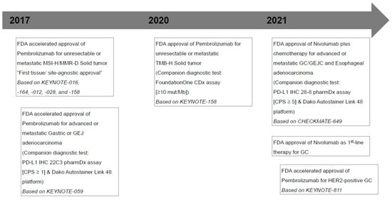 Despite advances in diagnostic imaging, surgical techniques, and systemic therapy, gastric cancer (GC) is one of the most common cancers, with a high mortality rate from cancer around the world [1,2]. Unfortunately, morphological and molecular heterogeneity and, consequently, acquired resistance in GC are the major causes of failure in the development of biomarker-guided targeted therapies [2,3]. However, by showing promising survival benefits in some studies, the recent emergence of immunotherapy in GC has had a significant impact on treatment-selectable procedures (Figure 1) [4,5,6,7,8]. To protect the host from external antigens and autoimmune reactions, the immune system is regulated via a number of receptor–ligand interactions [2,9,10]. Immune checkpoint inhibitors (ICIs), widely indicated in the treatment of several malignancies, target inhibitory receptors on T lymphocytes, including the programmed cell death protein (PD-1)/programmed death-ligand 1 (PD-L1) axis and cytotoxic T-lymphocyte-associated protein 4 (CTLA4), and release effector T-cells from negative feedback signals [2,10,11]. Currently, with limited samples, it is important to identify target biomarkers for predicting response to ICIs [12,13]. PD-L1 immunohistochemistry (IHC), microsatellite instability (MSI)/mismatch repair (MMR), Epstein–Barr virus (EBV), and tumor mutational burden (TMB) have been proposed as predictive biomarkers to predict response to ICIs in patients with GC [12,14]. In this article, we review currently available approved predictive biomarkers (excluding EBV) that affect the ICI treatment response, particularly focusing on PD-L1 expression. Unfortunately, the analysis of PD-L1 expression by IHC has several crucial challenges, including inter-observer variation in scoring and the use of different antibodies and staining platforms [13]. We also briefly outline these significant challenges. We further briefly describe alternate promoter utilization as a potential mechanism of resistance to ICIs in GC. This review may facilitate the expansion of the understanding of predictive biomarkers for ICIs and help select the appropriate therapeutic approaches for patients with GC.