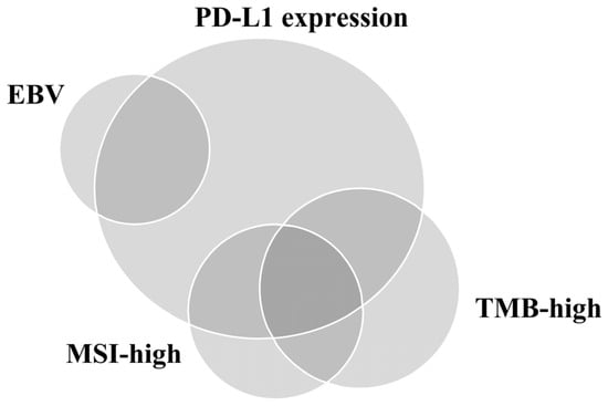 We reviewed the prospect and existing limitations of PD-L1 IHC assays and other approved predictive biomarkers (excluding EBV) for ICI response performed using samples from patients with GC (Table 2). The relationship between PD-L1 positivity, MSI-H, EBV positivity, and TMB is depicted in Figure 2 [64]. Unfortunately, it seems clear that no single test can be used as a reproducible proxy for predicting the advantage of immunotherapy [10]. Therefore, developing an integrated predictive model that considers the complex components affecting host–TIME interactions by reflecting the heterogeneity of GC is necessary. However, owing to companion diagnosis of ICIs, pathologists will be regularly requested for PD-L1 IHC assay results by oncologists in daily practice. Therefore, to overcome the inter-observer variation, pathologists should be properly trained using suitable GC samples. Furthermore, automated digital image analysis based on the accumulated technology can help evaluate PD-L1 IHC assays with high accuracy and consistency. Moreover, pathologists and clinicians should remember that MSI and EBV can exhibit intratumoral heterogeneity since this heterogeneity may affect the response to ICIs. Finally, owing to the difficulty of identifying the appropriate cutoff point for high and low TMB, using TMB as a robust predictor of ICI response in daily practice may be challenging.