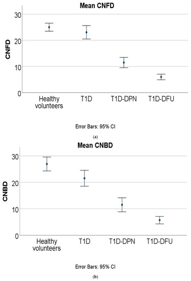 Participants with T1D-DPN and T1D-DFU had higher VPT and WT and lower SNCV and SNAP compared to those without neuropathy and healthy volunteers (Table 2). Participants with T1D-DFU and T1D-DPN had higher VPT (p < 0.001), lower SNCV (p < 0.001), but comparable SNAP (p = 0.147). Corneal nerve fibre density (CNFD), corneal nerve fibre length (CNFL) and corneal nerve branch density (CNBD) were lower in T1D-DPN and T1D-DFU compared to T1D (p < 0.001) and were lower in T1D-DFU compared to T1D-DPN (Table 2). Corneal nerve images from healthy volunteers, T1D, T1D-DPN and T1D-DFU are presented in Figure 1 and the progressive loss of corneal nerve fibres in each group are displayed in Figure 2a–c.
