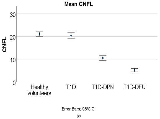 (a) Comparison of corneal nerve fibre density (CNFD) between groups. (b) Comparison of corneal nerve branch density (CNBD) between groups. (c) Comparison of corneal nerve fibre length (CNFL) between groups. T1D—type 1 diabetes; T1D-DPN—type 1 diabetes with diabetic peripheral neuropathy; T1D-DFU—type 1 diabetes with diabetic foot ulcer.