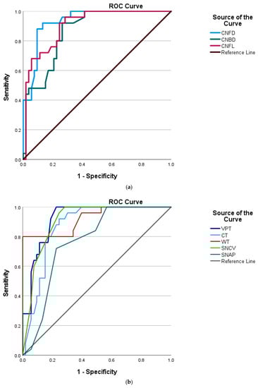 (a) ROC curves for CNFD, CNBD and CNFL for T1D-DFU. (b) ROC curves for VPT, CT, WT, SNCV and SNAP for T1D-DFU. CNFD—corneal nerve fibre density; CNBD—corneal nerve branch density; CNFL—corneal nerve fibre length; VPT—vibration perception threshold; CT—cold threshold; WT—warm threshold; SNCV—sural nerve conduction velocity; SNAP—sural nerve amplitude.