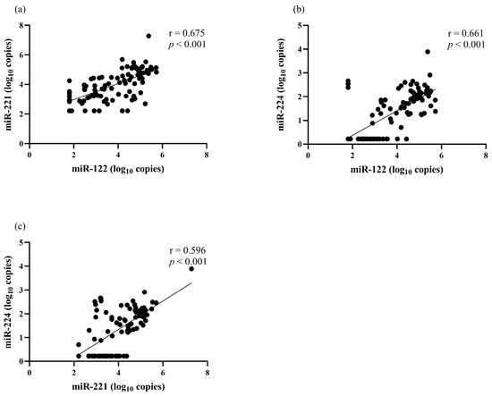 The correlation among serum miRNAs levels at baseline. (a) miR-122 and miR-221, (b) miR-122 and miR-224, (c) miR-221 and miR-224.