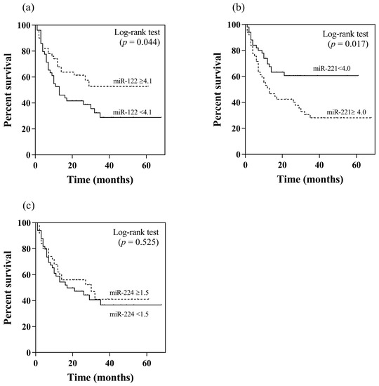 Kaplan–Meier analysis of overall survival in relation to pretreatment serum miRNA levels by using their median values as the cut-off points: (a) miR-122, (b) miR-221, (c) miR-224.