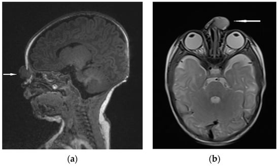 - Saettele, M.; Alexander, A.; Markovich, B.; Morelli, J.; Lowe, L.H. Congenital midline nasofrontal masses. Pediatr. Radiol. 2012, 42, 1119–1125. [Google Scholar] [CrossRef]