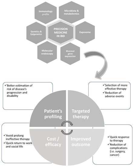 In this scenario, it has been hypothesized that given the failure of traditional statistical methodologies in improving the prediction of outcome, response to the therapy, etc., the application of different approaches such as machine learning (ML) and artificial intelligence (AI), by pulling and analyzing a large amount of clinical and biological data, might become a breakthrough and a game changer in IBD as is happening in oncology. In the next sections, the concept of precision medicine will be clarified, as well as the actual impact and application of the new methodologies and analysis in IBD and the different challenges to overcome. A more extensive review has been recently conducted in a Scientific Workshop of the ECCO [5,6].