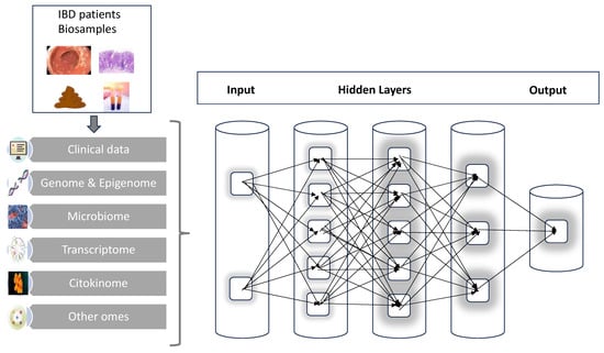 Conceptually, a possible structure for an IBD neural network can be organized into three major layers. The first layer is where all the input is conveyed, responsible for handling the individual IBD omics such as genome, transcriptome, etc. Next, we must imagine hidden layers that will perform all the complex calculations, interactions and combinations of parameters. Finally, there will be the output layer that, after receiving the signals for the hidden layers, will finally process and provide the results (Figure 2). There are already preliminary applications and results of this methodology that will be detailed in the next sections. There is, however, still the need to evaluate in IBD which is the best computation tool for the specific information that is under investigation.