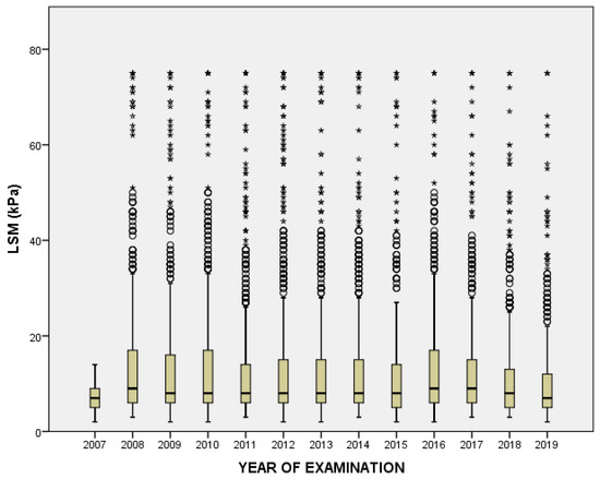 Table 5 delineates the mean Liver Stiffness Measurement (LSM) values over a span of 13 years, from 2007 to 2019. The data reveal an upward spike in the mean LSM value in 2008, reaching 15.20, which is more than double the mean value of the previous year, 2007. This sudden increase is accompanied by a substantial standard deviation (SD) of 15.14, indicating a wide dispersion of the data points in 2008. Over the subsequent years, from 2009 to 2014, the mean LSM values stabilized within a range of approximately 13–14. However, starting from 2015, a gradual downward trend appears, with 2019 displaying the lowest mean value of 10.58 during the entire period (Figure 1). It is also noteworthy that while the mean values fluctuate across the years, the SD tends to decrease progressively, suggesting that the data points are becoming less dispersed and more concentrated around the mean as time progresses. When evaluating only HCV (Figure 2) and HBV (Figure 3) patients, respectively, we can observe a decrease over the years in HCV patients.