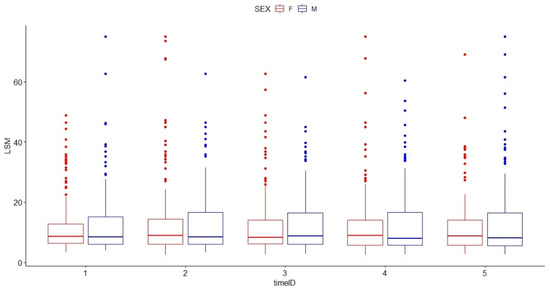 Boxplot graph of liver stiffness measurement values over time for the two sexes in patients with viral hepatitis (n = 326 viral hepatitis patients with at least five liver stiffness measurement values). The dots represent the outliers. The outliers for femeles are presented in Red and for males in Blue.