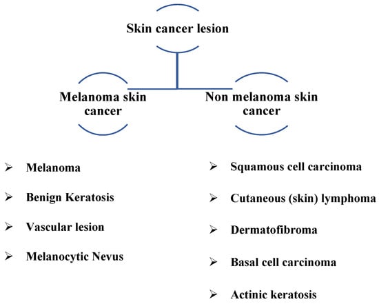 In 2023, the American Cancer Society predicts that about 97,610 new melanomas will be diagnosed in the country [3]. Melanoma is predicted to be fatal to approximately 7990 people (about 5420 men and 2570 women). Rates of melanoma have considerably increased in recent decades. On the other hand, it is more deadly since it can spread to many other body areas if it is not detected and treated promptly. In addition, it is associated with melanocytes, which cause malignant cells to change color, thus accounting for the bulk of pigmented skin cancer deaths [4]. Figure 1 depicts various types of skin cancer lesions, including common types detected.