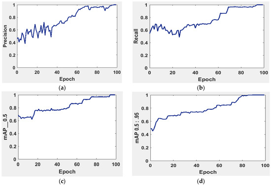 The precision and recall curves in Figure 5a,b are implemented at a network size and evaluated at the GIOU threshold range from 0.5 to 0.95. The model worked well throughout, with the greatest MAP from 0.5 to 0.95 value of 98.7% occurring for the network size 224 with a threshold value equal to 0.5. Additionally, the weights produced with YOLOv5 (S-Model) require 14 MB.