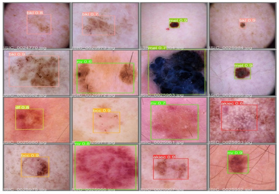 The MAP determines the area under the precision–recall curve, making it a useful tool for comparing various models regardless of the confidence level. Figure 5a,b illustrates how recall and precision grow with increasing epochs. Additionally, when the confidence score for each class differs, the effectiveness of the melanoma detection performed with the YOLOv5 models is evaluated by looking at the precision–recall curve. When precision retains a considerable contribution to growth in the recall, it is easier to evaluate the capacity to predict melanoma. The goal is to find the confidence level that maximizes F1 across all classes. In this case, the results are shown in Figure 6 with a confidence of 70.8%, a precision of 96.0%, and a recall of 91.0%. In the illustration in Figure 7, batch selections are made from the testing set to display the bounding box for each class with each probability.