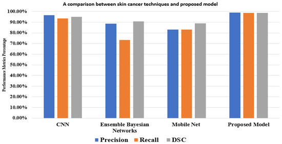 A mask RCNN-based model was proposed by Khan et al. [43]. The decorrelation formulation algorithm was used to perform the initial preprocessing of the dermoscopy images. It forwarded the obtained pictures to the MASK-RCNN for lesion segmentation. In this step, the segmented RGB pictures are produced from the ground truth images of the ISIC datasets, and the MASK RCNN model is trained. The DenseNet deep model was given the segmented images as a response to extract features from [44]. It used a Mobile Net model that was transfer-learned and fine-tuned on 10,015 dermoscopy pictures from the HAM10000 dataset after being pre-trained on roughly 1,280,000 images from the 2014 ImageNet Challenge. Figure 8 displays the outcomes of the proposed model and various models based on the same dataset (HAM10000). These comparisons demonstrate that, in performance matrices, the proposed model outperforms CNN, Ensemble Bayesian, and Mobile Net approaches.