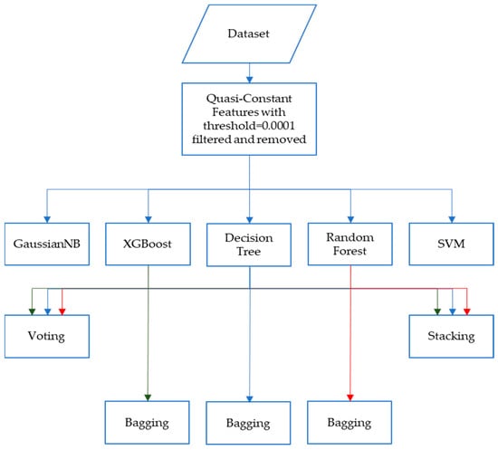 The performance evaluation revealed that among the tested classification algorithms, Decision Tree, Random Forest, and XGBoost exhibited the highest classification accuracy and predictive power. Building upon this finding, further analysis was conducted by employing ensemble learning methods: stacking and voting, using the three best-performing algorithms. Additionally, bagging was also applied to the three selected algorithms to explore potential performance enhancements and model robustness. The first method is summarized in Figure 1.