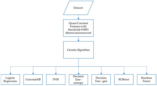 In the second method, after filtering out the quasi-constant features, a genetic algorithm was utilized to further optimize the feature selection process for the same set of classification algorithms: GaussianNB, SVM, Decision Tree (with entropy and Gini index), XGBoost, Random Forest, and additionally, logistic regression. A pictorial representation of the second method is shown in Figure 2.