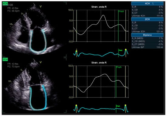 Two-dimensional left atrial strain using speckle tracking echocardiography obtained from the apical four-chamber (upper panel) and two-chamber (lower panel) views.