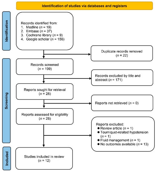 A literature search was conducted across four electronic databases, Medline (OVID), Embase (OVID), Google Scholar, and Cochrane Library, resulting in the retrieval of 221 studies. After excluding duplicate records (22 in total) and screening titles and abstracts to eliminate unsuitable ones (171 in total), a final selection of 28 reports was identified for further analysis. Review articles (n = 1), studies focusing on tourniquet-related hypotension (n = 1) or fluid assessment (n = 1), and those lacking available outcome data (n = 13) were subsequently excluded, leaving a final total of 12 studies with 1076 patients for the final review (Figure 1) [18,21,22,23,24,25,28,29,30,31,32,33].