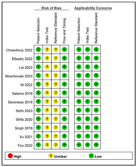 The Quality Assessment for Diagnostic Accuracy Studies-2 (QUADAS-2) tool was used to assess the methodological quality of each study [26]. The ‘applicability concerns’ category encompasses three domains, whereas the ‘risk of bias’ category includes four domains. Both team members conducted an independent subjective review of the included studies, assessing each domain with ratings of “low risk”, “unclear”, or “high risk”. Any discrepancies that arose during this assessment process were addressed through extensive discussion until a consensus was reached. In instances where reaching a consensus proved challenging, a third author was engaged in facilitating the resolution of the disagreements.