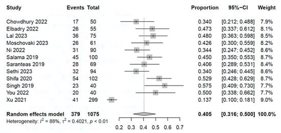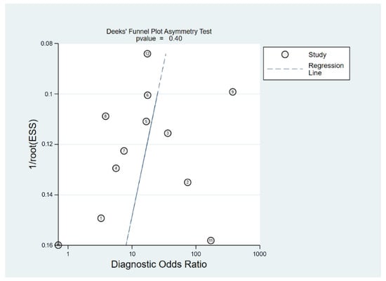 The presence of publication bias among the studies in the analysis was evaluated using Deek’s funnel plot asymmetry test, suggesting a low risk of publication bias (p = 0.4) [18,21,22,23,24,25,28,29,30,31,32,33].