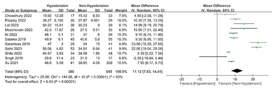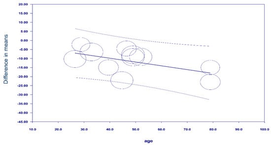 Eleven of the twelve studies [18,21,22,23,24,25,28,29,30,31,32] found that approximately 1/3 to 1/2 of their patients suffered from hypotension (range: 34–57.5%), while one report [33] reported a 13.71% incidence rate (Figure 3). Patients with spinal-induced hypotension had a significantly higher IVC collapsibility index than those without spinal-induced hypotension (mean difference: 11.12%, 95% CI: 7.83 to 14.41, p < 0.00001, I2 = 93%) (Figure 4). Meta-regression analysis showed a correlation between patient age and the IVC collapsibility index (coefficient: −0.21, p = 0.0385) (Figure 5).