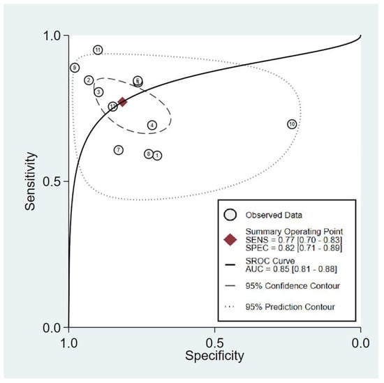 The sensitivity and specificity of the individual studies are shown in Figure 6. In five studies [24,25,28,29,30], the sensitivity values were below 70%, ranging from 58.8% to 69%. In contrast, in the remaining seven studies [18,21,22,23,31,32,33], the sensitivity values were above 70%, with a range of 75.6% to 95%. The specificity values across studies also showed considerable variation, ranging from 23.5% to 98.8%. The overall sensitivity was 77% (95% confidence interval: 70–83%), while the overall specificity was 82% (95% confidence interval:71–89%) (Figure 6) [18,21,22,23,24,25,28,29,30,31,32,33]. The pooled AUC was 0.85, suggesting a high probability of distinguishing between subjects with spinal-induced hypotension and those without (Figure 7). The predictive capacity of the IVC collapsibility index for hypotension was assessed using Fagan nomograms. The positive and negative likelihood ratios were found to be 4 and 0.28, respectively (Figure 8). Given an initial pretest probability of 50%, the incorporation of the IVC collapsibility index as a diagnostic test yielded post-test probabilities of 81% for a positive result and 22% for a negative result (Figure 8). Additionally, Deek’s funnel plot asymmetry test revealed a low risk of publication bias regarding the diagnostic efficacy of the IVC collapsibility index (p = 0.4) (Figure 9) [18,21,22,23,24,25,28,29,30,31,32,33].