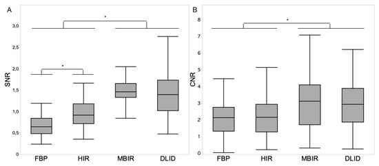 The CNR for renal parenchyma vs. urine was significantly higher in MBIR and DLID compared to HIR and FBP (3.1 ± 1.7 and 3.0 ± 1.4 vs. 2.3 ± 1.2 and 2.2 ± 1.0; p < 0.05) (Figure 1B).