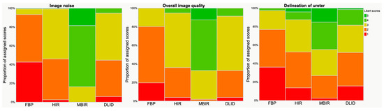 Results of qualitative analysis. Visualization with Likert scale (scoring between 1 and 5, see also Table 1). Image noise, overall image quality and delineation of ureter received significantly higher ratings in MBIR, followed by HIR/DLID and FBP.