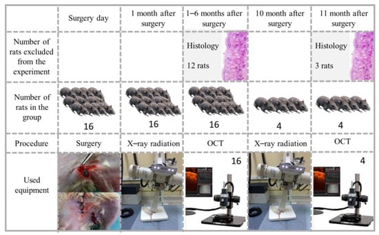 Three C-scans were measured for each rat limb just after the surgery. Also, 36 and 9 C-scans were measured for the same limbs after the first and the second X-ray radiation exposures, respectively. The same number of images was measured for healthy limbs. Differing amounts of data were due to the withdrawal of some animals from the experiment (Figure 1).