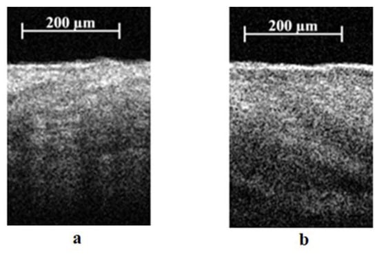 An example of B-scans of healthy tissue (a) and lymphedematous tissue (b) from the developed model.