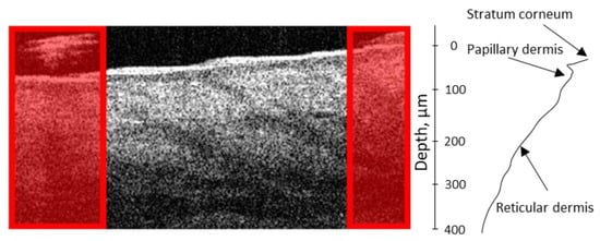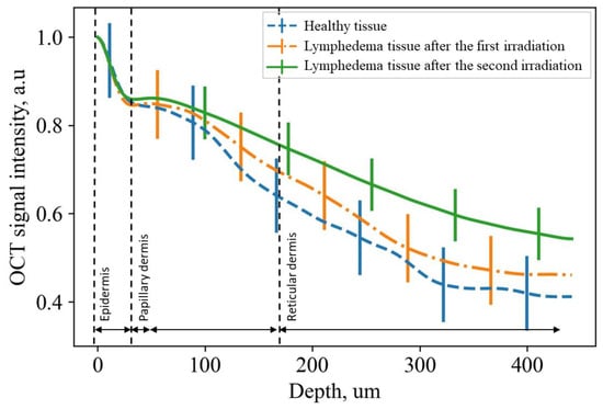 According to the procedure described above, the dependence of the intensity of OCT signals on depth (average A-scan) was estimated (see Figure 7).