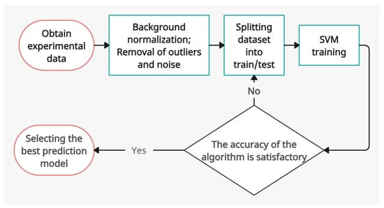 A machine learning (ML) algorithm for the diagnosis of lymphedema using OCT data was implemented. The task of a two-class classification was set in which one class corresponded to healthy tissue and the other corresponded to lymphedematous tissue. A Support Vector Machine (SVM) with a Radial Basis Function (RBF) kernel was used for the binary classification. The ML pipeline scheme is shown in Figure 5.