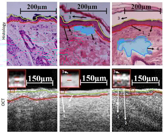 The following morphological changes can be observed upon comparing the histology and OCT images. First, a thinning of the epithelial layer (viable epidermis, “2”) and a thickening of the stratum corneum were observed after the first and the second exposures to X-ray radiation. Next, a smoothening of the dermal–epidermal junction can be seen for the irradiated skin (“4”), as well as the emergence of areas with increased water content (areas colored in blue).
