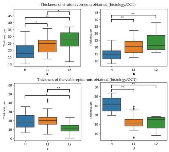 Boxplots of the thickness of the stratum corneum (histology (a), OCT (b)) and viable epidermis (histology (c), OCT (d)) skin layers for the healthy (H) and lymphedematous skin after the first (L1) and the second (L2) X-ray irradiation. * and ** correspond to p-value < 0.05 and p-value < 0.01, respectively.