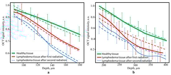 On the averaged A-scan, the position of the local intensity minimum corresponds to the end of the stratum corneum and the beginning of the viable epidermis, and the position of the second maximum corresponds to the beginning of the dermis; therefore, the signal after the second peak was taken as a signal from the dermis. For the stratum corneum measured via histology and OCT, there are statistically significant differences the normal and lymphedematous tissues (see Figure 8a,b). It can be noted that while the histology data did not reveal significant changes in epidermal thickness following the initial radiation exposure, OCT was able to detect differences (see Figure 8c,d).