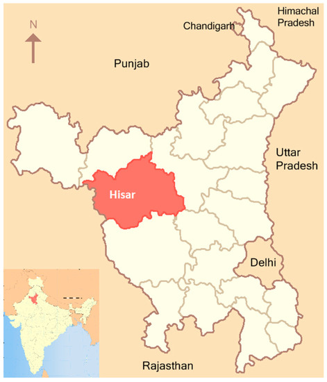 - Hisar District. Available online: https://commons.wikimedia.org/wiki/File:HaryanaHisar.png (accessed on 17 August 2023).
