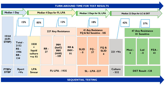 Specimens completing TB diagnostic tests as per NTEP algorithm and median turnaround time under the One-Stop TB Diagnostic solution model. Abbreviations: PTBPs—presumptive TB patients, DTBP—Diagnosed TB Patients, RS—rifampicin sensitive, RR—rifampicin resistance, INH—isoniazid, LPA—Line Probe Assay, FL-LPA- first line LPA, SL-LPA—second line LPA, SLID—second-line injectable drugs, FQ—fluoroquinolones, +Ve—positive, Moxi—moxifloxacin, Lzd- Linezolid, PZA—pyrazinamide. LC—liquid culture, LC and DST—liquid culture and drug susceptibility testing, DST—drug susceptibility tests.