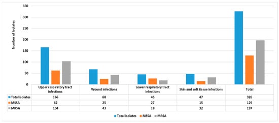 According to the culture technique, 326 (11.64%) S. aureus isolates were identified out of 2800 samples. As shown in Figure 1, 166/326 (51%) were isolated from upper respiratory tract infections, with 62 (37.5%) MSSA and 104 (62.5%) being MRSA. Additionally, 68/326 (20.85%) were isolated from wound infections, with 25 (36.77%) being MSSA and 43 (63.23%) being MRSA. Furthermore, 45/326 (13.8%) isolates from lower respiratory tract infections were identified, with 27 (60%) being MSSA and 18 (40%) being MRSA. Finally, 47/326 (14.28%) isolates from skin and soft tissue infections were identified, with 15 (33.33%) being MSSA and 32 (68.67%) being MRSA. Based on these results, it was concluded that 197/326 (60.43%) of all samples were MRSA, while 129 (39.57%) were MSSA.