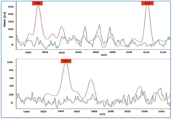 Based on the single-peak analysis of different mass regions, it was revealed that differences in the single-peak analyses could be used to differentiate between the strains of MSSA and MRSA. We observed numerous single peak signals in the range of 3990 to 5850 Da (Figure 2), suggesting that MSSA and MRSA strains differ greatly in their intensity levels. The MRSA (red color) patterns contained four single peak intensities located at 3990 Da, 4120 Da, and 5850 Da, whereas MSSA (green color) patterns did not contain these single peak intensities.