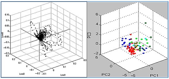 The PCA dimensional image represents several spectra for S. aureus isolates recovered from clinical samples. The spots represent the strength of a single signal, with the signal strength altered up to the loading value consistent with loadings 1, 2, and 3.